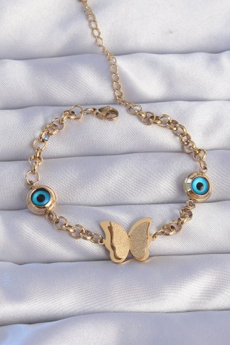 316L Çelik Gold Renk Simli Kelebek Model Nazarlı Zincir Bileklik