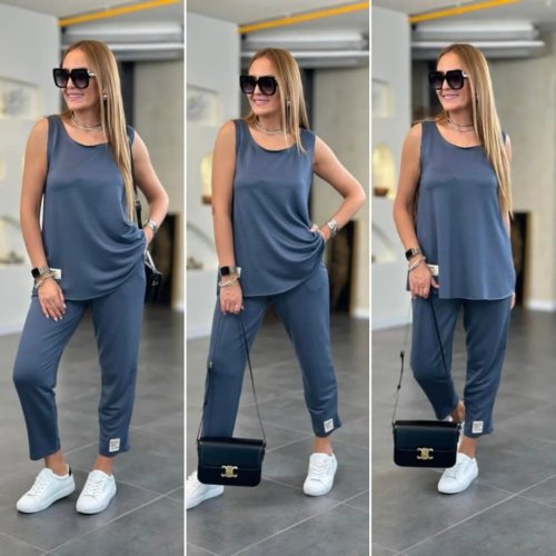 Kadın pamuklu kumaş armalı sıfır kol üst ve pantolon takım