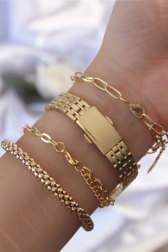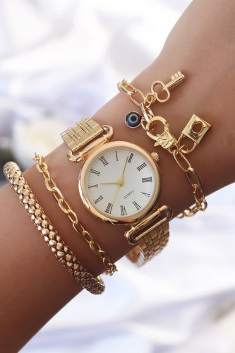 Gold Renk Roma Rakamlı Beyaz Kadran Metal Kordonlu Saat ve Bileklik Kombini