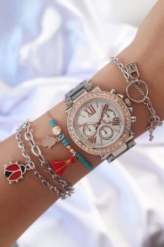 Gümüş Renk Roma Rakamlı Zirkon Taşlı Rose Kasa Saat ve Bileklik Kombini