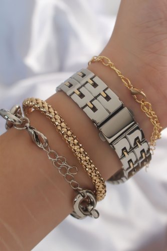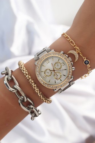 Gümüş Renk Roma Rakamlı Zirkon Taşlı Gold Kasa Saat ve Bileklik Kombini
