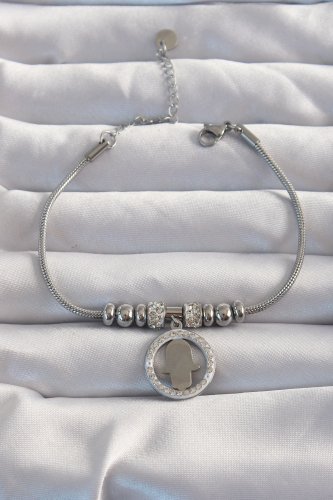 316L Çelik Gümüş Renk Zirkon Taş Aksesuarlı Fatma Ana Eli Bileklik