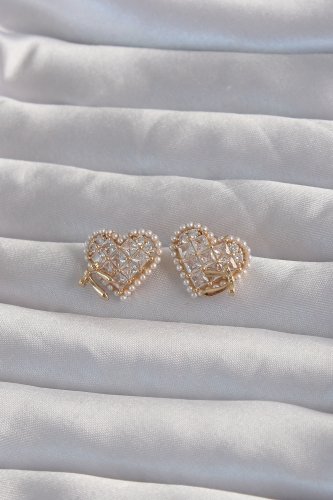 Pirinç Gold Renk Fiyonk Detay İncili Zirkon Taşlı Kalp Küpe