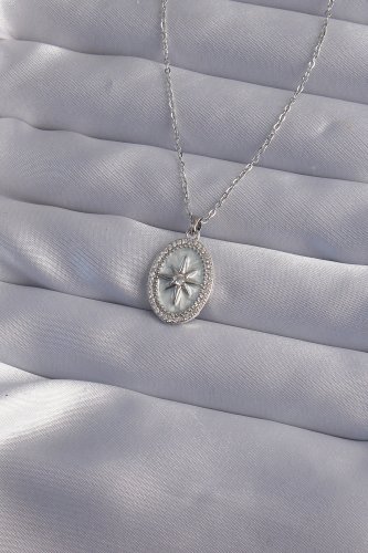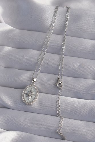 316L Çelik Zincir Gümüş Renk Zirkon Taşlı Kabartmalı Kutup Yıldızı Kolye