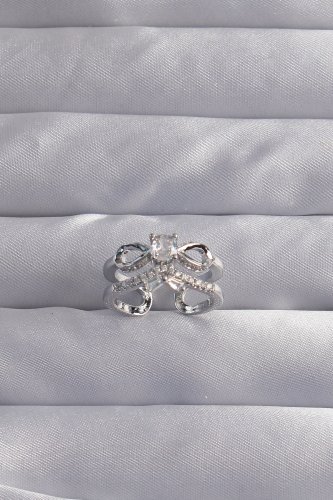 Pirinç Ayarlamalı Gümüş Renk Zirkon Taşlı 2li Görünüm Fiyonk Yüzük