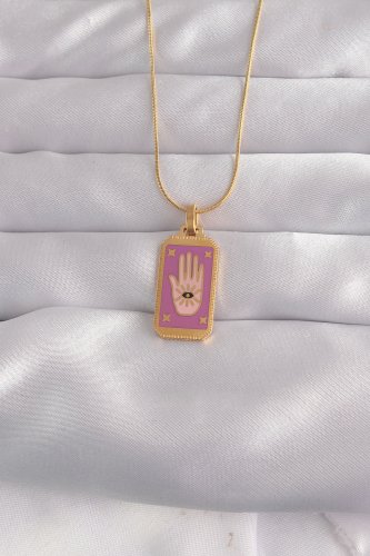 316L Çelik Gold Renk Mor Mineli El Figür Tarot Kolye