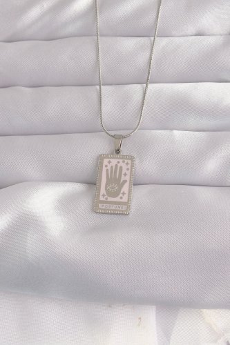 316L Çelik Gümüş Renk Pembe Mineli El Figür Tarot Kolye