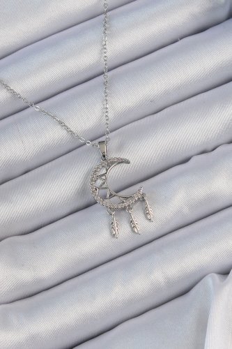 316L Çelik Zincir Gümüş Renk İşlemeli Zirkon Taşlı Ay Kolye