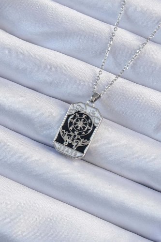 316L Çelik Zincir Gümüş Renk İşlemeli Siyah Mineli Tarot Kolye
