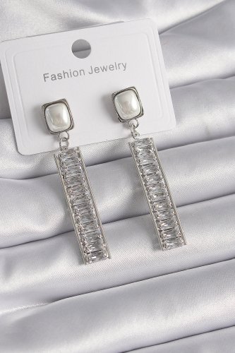 Pirinç Gümüş Renk Kare İnci Zirkon Taşlı Su Yolu Model Kadın Küpe