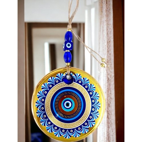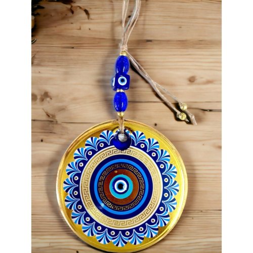 Gold Cam Üzeri Mavi Motifli Nazar Boncuklu Göz Detaylı Duvar Süsü