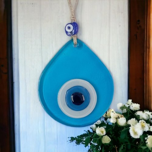 Orta Boy Şeffaf Turkuaz Damla Desen Nazar Boncuklu Duvar Dekoru Cam Duvar Süsü