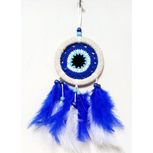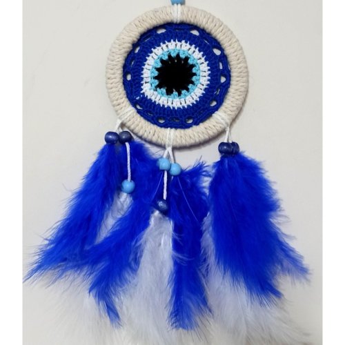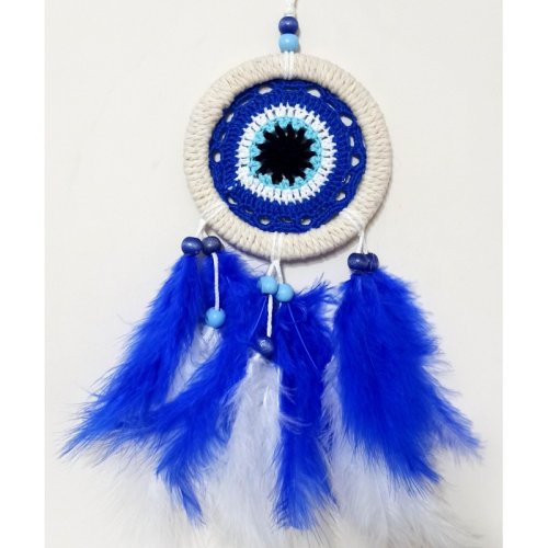 Saks Mavisi Kuş Tüylü Nazar Boncuğu Motifli El Yapımı Duvar Süsü