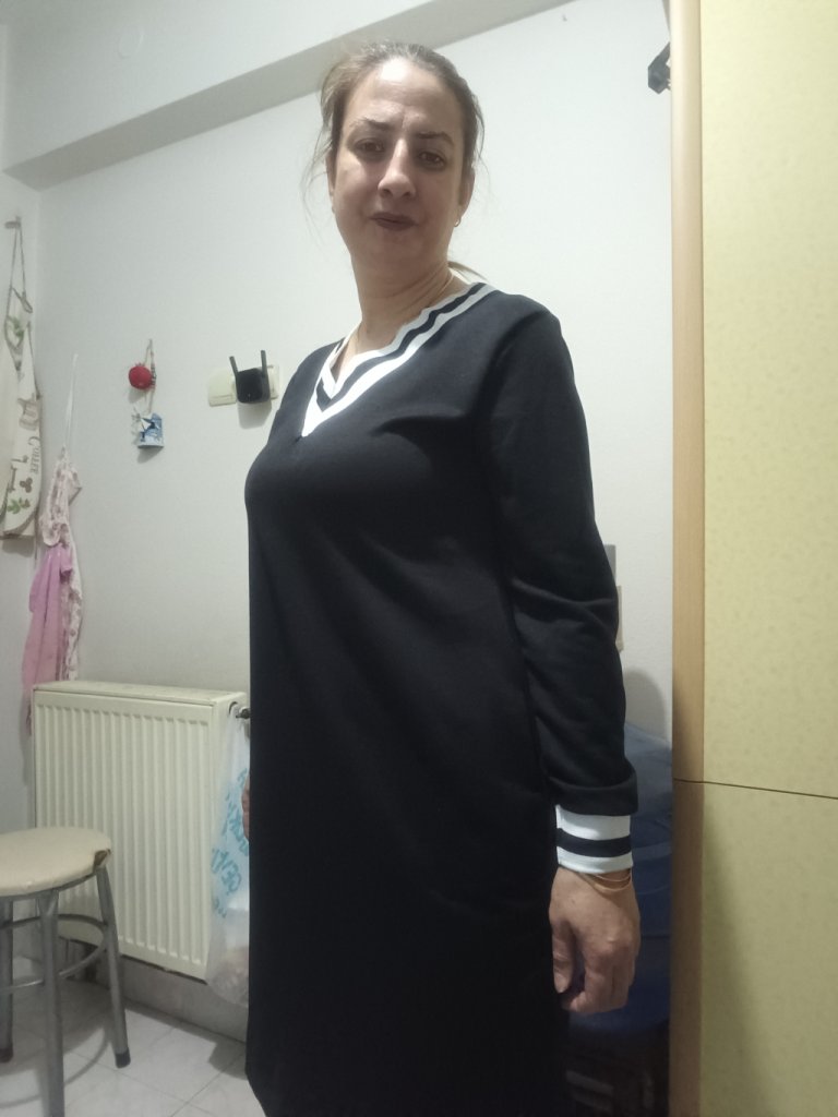 Kadın uzun kollu V yaka şeritli iki iplik salaş elbise