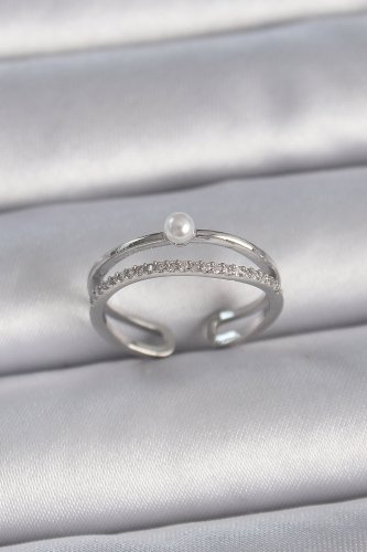 Pirinç Gümüş Renk Zirkon Taşlı İnci Detay Ayarlanabilir Model Kadın Yüzük