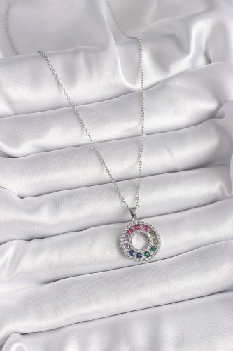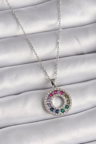 316L Çelik Gümüş Renk Zincir Renkli Zirkon Taşlı Madalyon Model Kadın Kolye