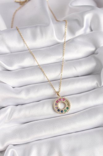 316L Çelik Gold Renk Zincir Renkli Zirkon Taşlı Madalyon Model Kadın Kolye