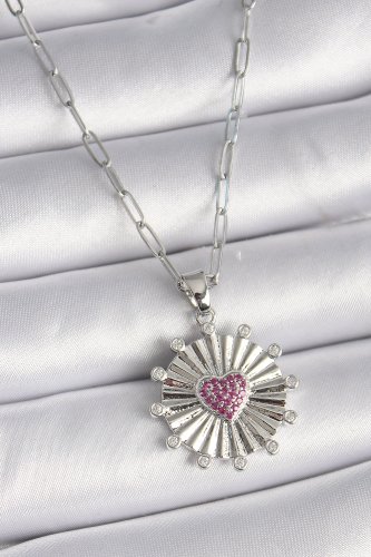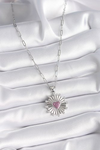 316L Çelik Gümüş Renk Pembe Zirkon Taşlı Kalp İşleme Madalyon Model Kadın Kolye