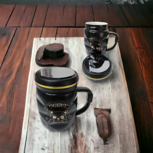 Ayna Kapaklı Panda Desenli Porselen Kupa Bardak Siyah Kupa Bardak