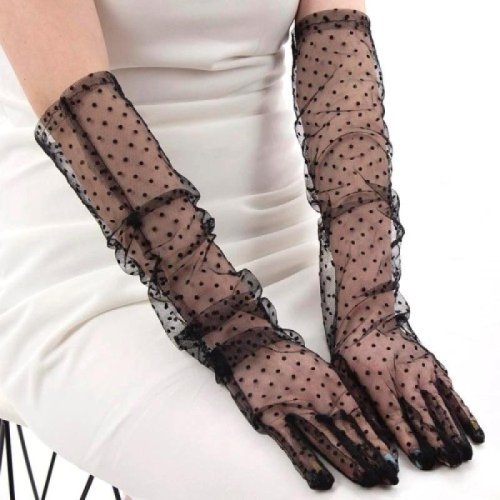 Uzun Siyah Puantiyeli Yetişkin Tül Eldiven
