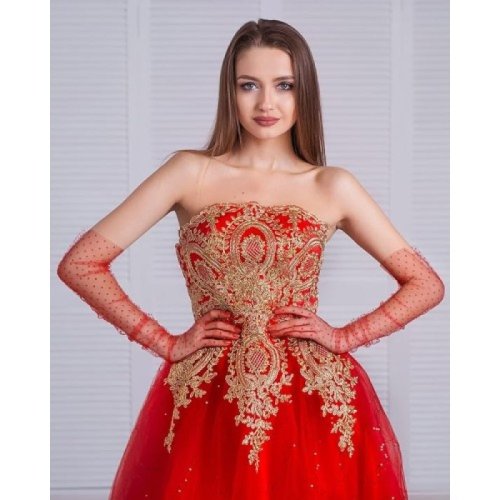 Uzun Boy Kırmızı Puantiyeli Kırmızı Renk Yetişkin Tül Eldiven