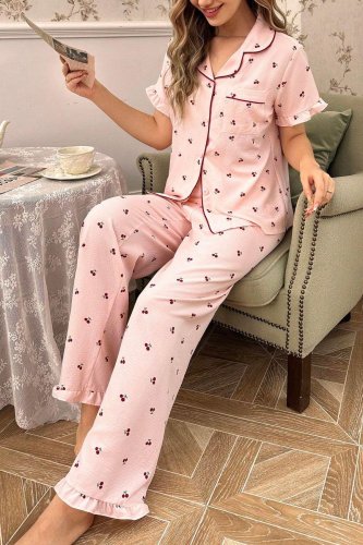 Kiraz Desenli Düğmeli Bebe Yaka Pijama Takımı 7035
