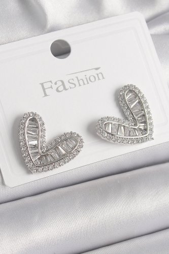 Pirinç Gümüş Renk Zirkon Taşlı Kalp Model Kadın Küpe