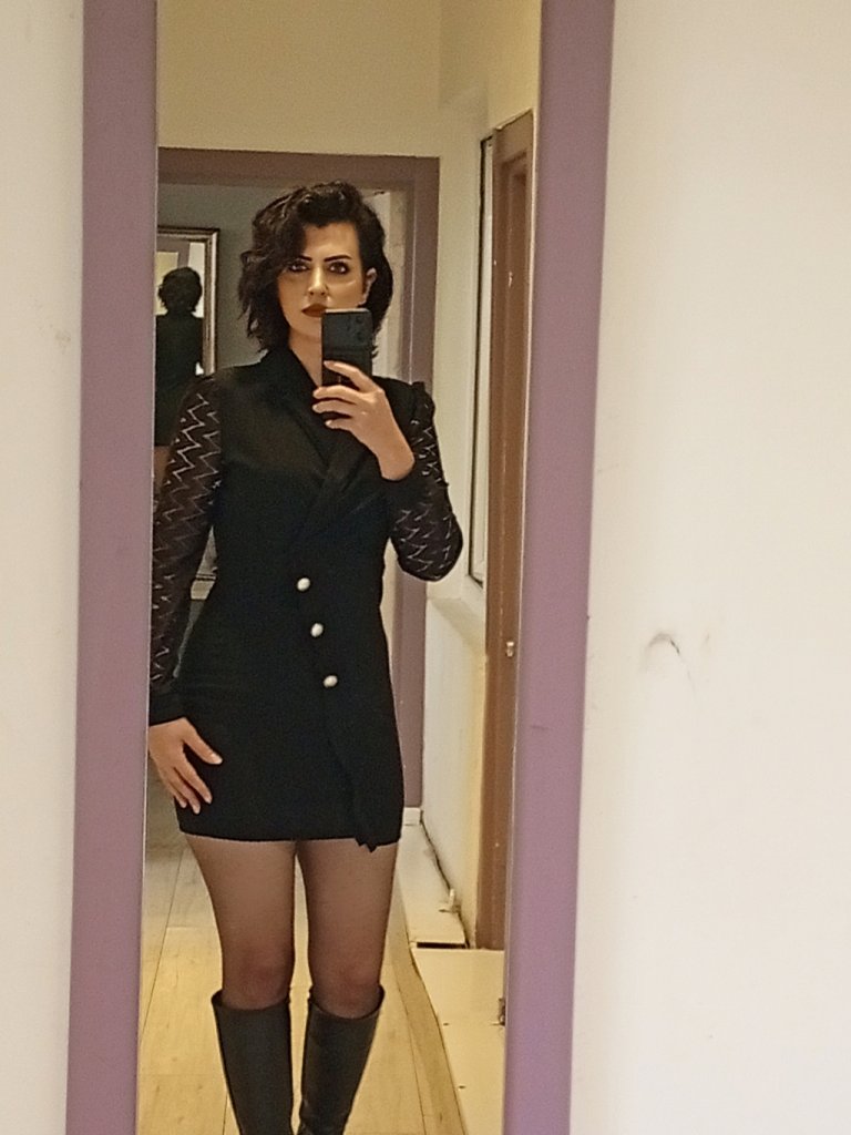 Kadın uzun kollu eteği düğme kolu tül detay ithal krep ceket yaka mini elbise