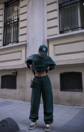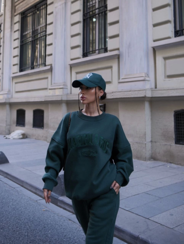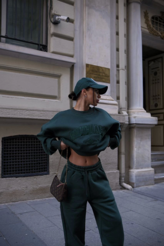 Bisiklet Yaka Nakış İşlemeli Üç İplik Sweat Takım - Yeşil