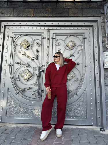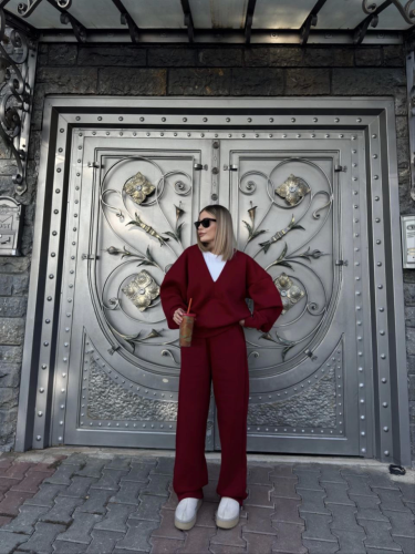 Geniş V Yaka Üç İplik Sweat Takım - Bordo