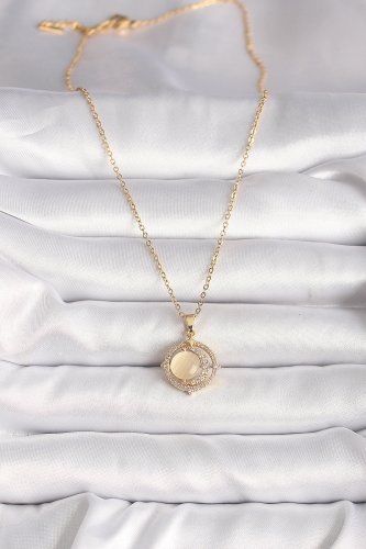 316L Çelik Gold Renk Zirkon Taşlı Sarı Sedefli Hilal Model Kadın Kolye