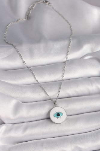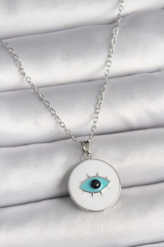 316L Çelik Gümüş Renk Zincir Beyaz Mineli Turkuaz Göz İşleme Model Kadın Kolye