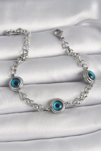 316L Çelik Gümüş Renk Zincir Model Nazar Boncuklu Kadın Bileklik