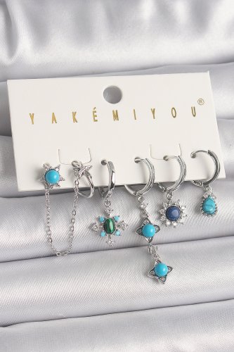 Pirinç Gümüş Renk Zirkon Taş Detaylı Mavi Boncuklu Çiçek Model VIP Seri Kadın Küpe Kombini