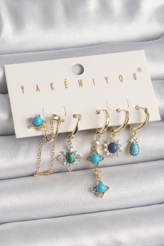 Pirinç Gold Renk Zirkon Taşlı Mavi Boncuklu Çiçek Model VIP Seri Kadın Küpe Kombini