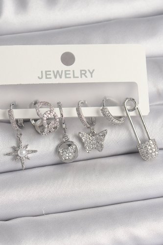 Pirinç Gümüş Renk Sallantı Zirkon Taşlı Kelebek Figür Kadın Küpe Seti