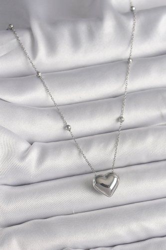 316L Çelik Gümüş Renk Topçuk Detay Zincir Kalp Model Kadın Kolye