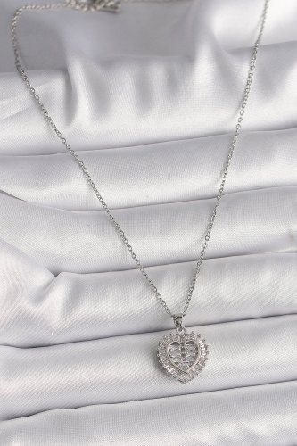 316L Çelik Gümüş Renk Zincir Zirkon Taşlı Kalp Model Kadın Kolye
