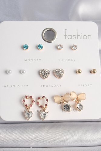 Pirinç Gold Renk Zirkon Taşlı Kalp Beyaz Mineli Fiyonk Figür 7 Çift Kadın Küpe Seti