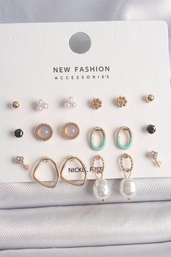 Pirinç Gold Renk İncili Halka Model 9 Çift Kadın Küpe Seti