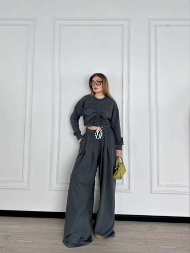 Uzun Kollu Önü İp Büzgülü Crop ve Pantolon İkili Takım - Antrasit