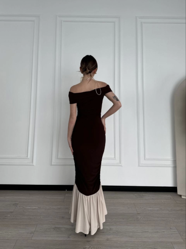 Striptiz Omuzlu Uzun Elbise- Kahve