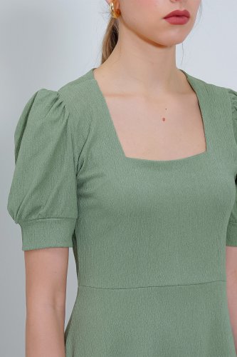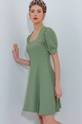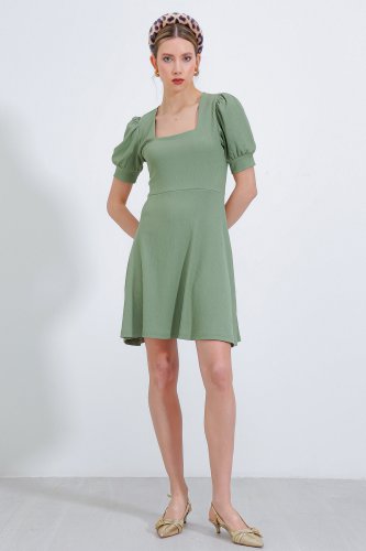 Çağla Yeşili Kare Yaka Örme Mini Elbise