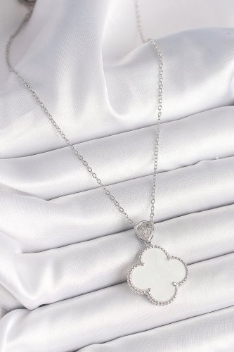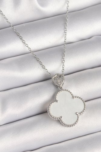 316L Çelik Gümüş Renk Zincir Zirkon Taş Detaylı Beyaz Yonca Model Kadın Kolye