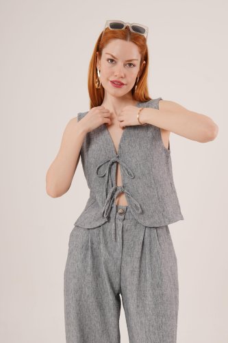 Ön Bağlama Detaylı Yelek Ve Pantolon Antrasit İkili Takım