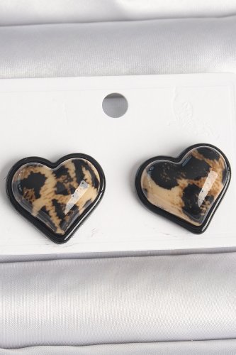 Pirinç Siyah Renk Leopar Desen 3D Kalp Model Kadın Küpe