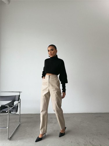 DERİ PANTOLON DİZ PARÇALI - Taş