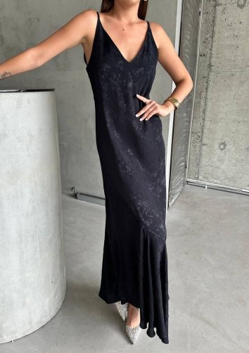 JAKARLI ASKILI SATEN ELBİSE ASİMETRİK - Siyah