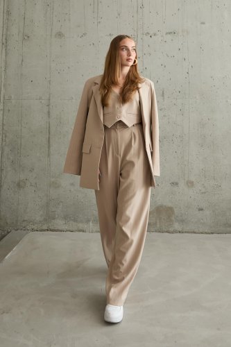 Bej Çizgili Ceket Yelek Ve Pantolon Takım