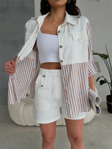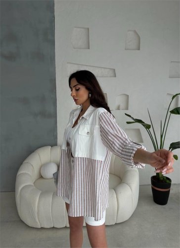 GABARDİN ŞORT - GABARDİN - ÇİZGİLİ KETEN GARNİLİ CEKET TAKIM - Kahverengi